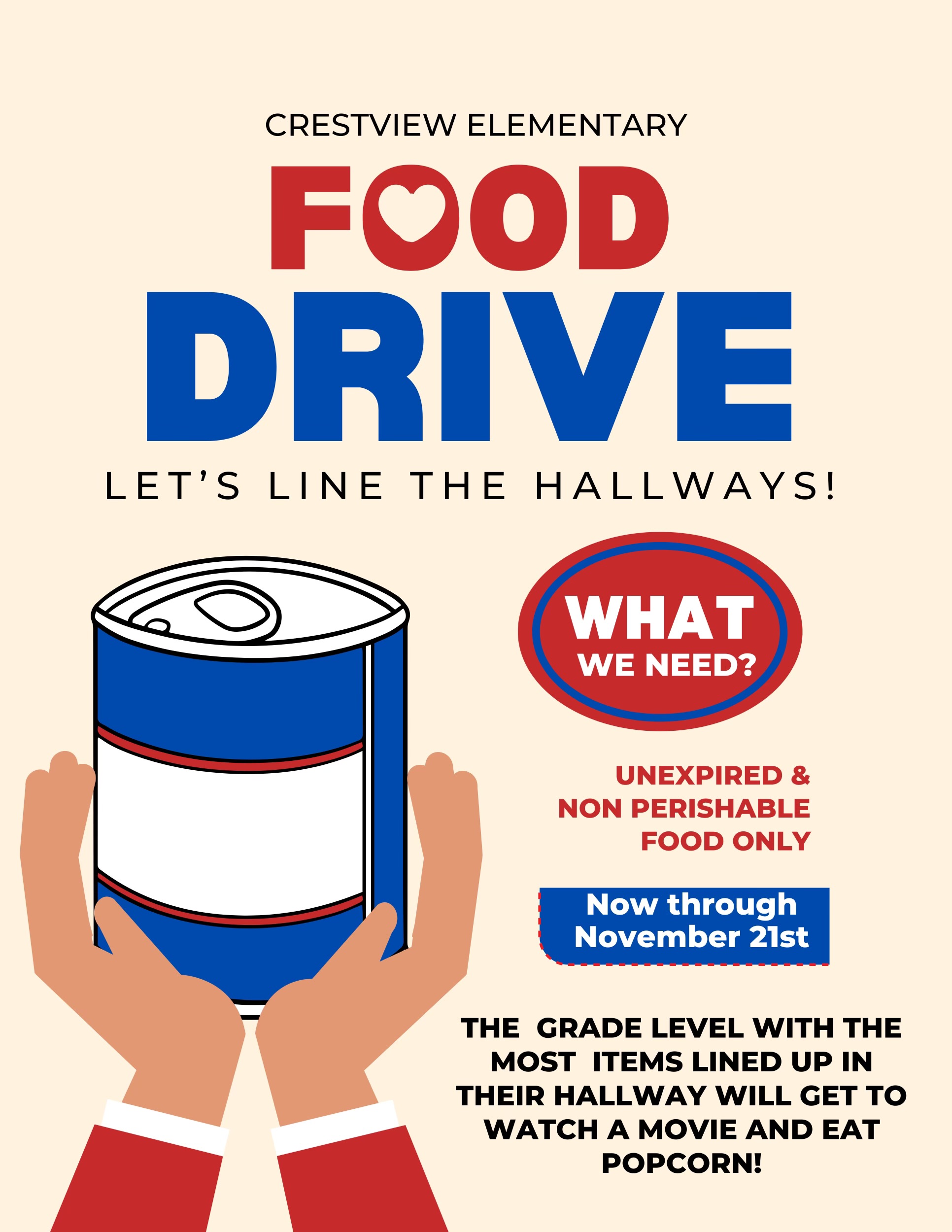 Update: 1st grade is currently in the lead with 105 items collected, BUT 3rd grade is coming from behind to catch up! Bring your cans/items by Friday morning if you want to contribute.